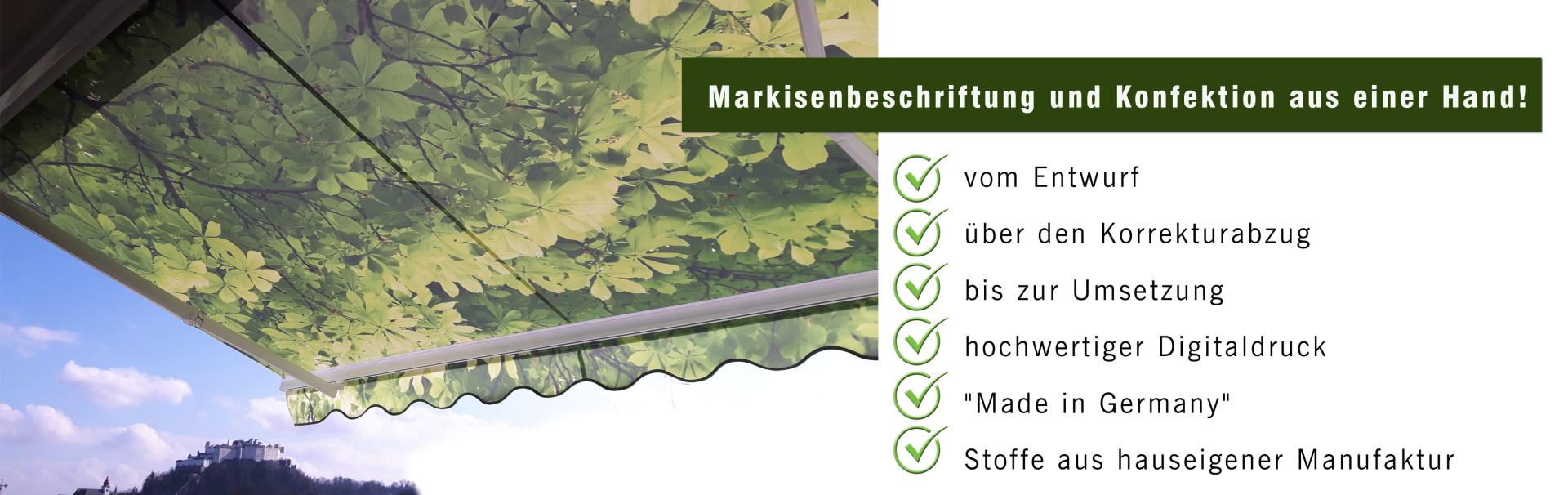 Im Digitalruck können auch mehrfarbige Logos gedruckt werden. Markisentücher sind nicht nur ein optimaler Sonnenschutz mit Flächenwirkung und eignen sich für besonders gut für Geschäftsmarkise im Einzelhandel, für Ladengeschäfte und Ladenlokals. Das Gewebe des Markisentuches ist optimal für den Aussenbereich zum drucken geeignet. Gern können wir Sie individuell zu den vielfältigen Einsatzmöglichkeiten von Foto-Markisen beraten.